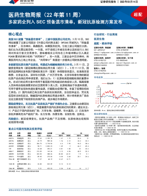 【国信证券】【20220314】医药生物周报:多家药企列入SEC预备退市清单,新冠抗原检测方案发布-14页 行业研究