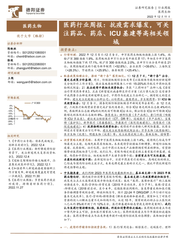 【德邦证券】【20221211】医药行业周报:抗疫需求爆发,可关注药品、药店、ICU基建等高相关领域-25页 行业研究
