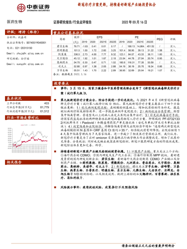 【中泰证券】【20220316】医药生物行业点评报告:新冠诊疗方案更新,持续看好新冠产业链投资机会-3页 行业研究