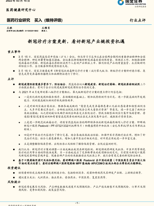 【国金证券】【20220315】新冠诊疗方案更新与新冠产业链投资机遇-3页 行业研究