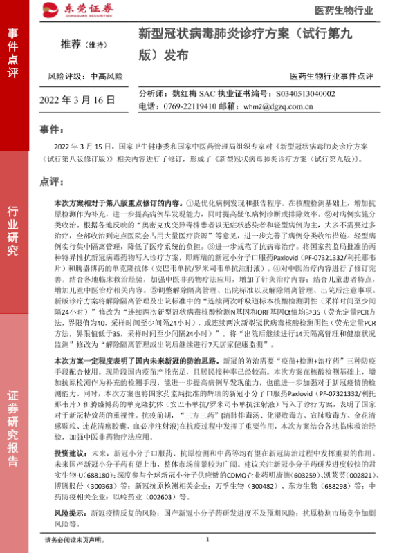 【东莞证券】【20220316】医药生物行业事件点评:新型冠状病毒肺炎诊疗方案(试行第九版)发布-3页 行业研究