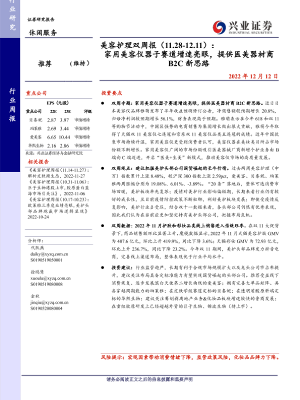 【兴业证券】【20221212】美容护理双周报:家用美容仪器子赛道增速亮眼,提供医美器材商B2C新思路-18页 行业研究