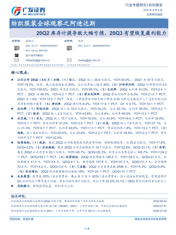 【广发证券】【20200808】纺织服装全球观察之阿迪达斯:20Q2库存计提导致大幅亏损,20Q3有望恢复盈利能力-8页 行业研究