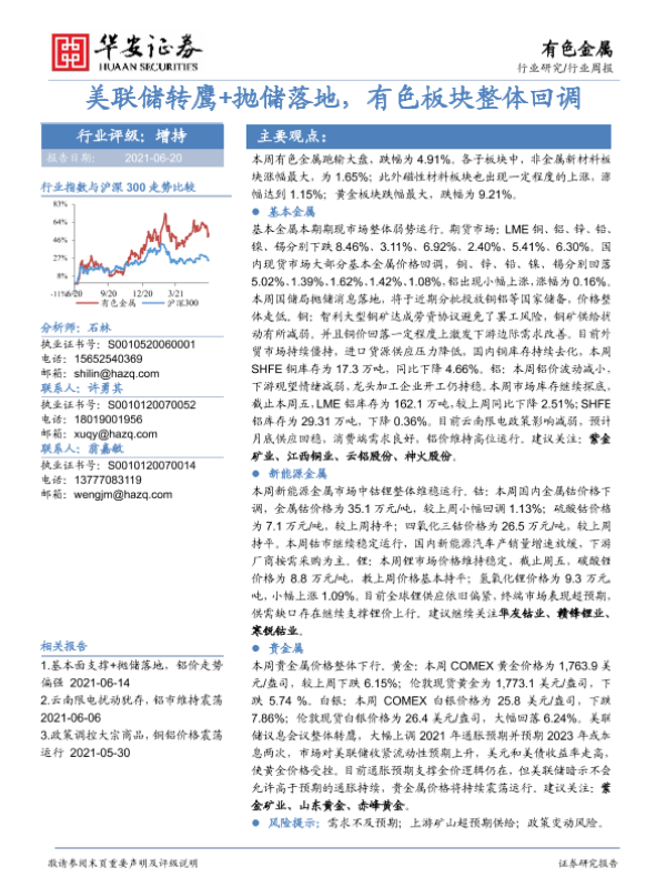 【华安证券】【20210620】20210620-华安证券-有色金属行业周报:美联储转鹰+抛储落地,有色板块整体回调-13页 行业研究