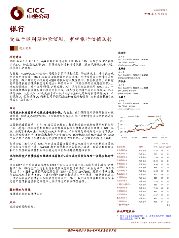 【中金公司】【20210326】银行:受益于顺周期和紧信用,重申银行估值反转-7页 行业研究