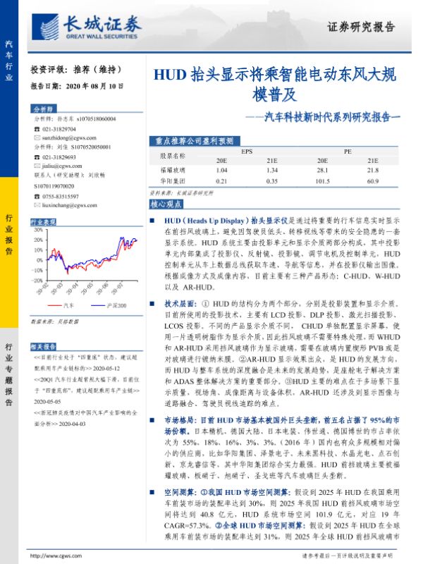 【长城证券】【20200810】汽车科技新时代系列研究报告一:HUD抬头显示将乘智能电动东风大规模普及-28页 行业研究