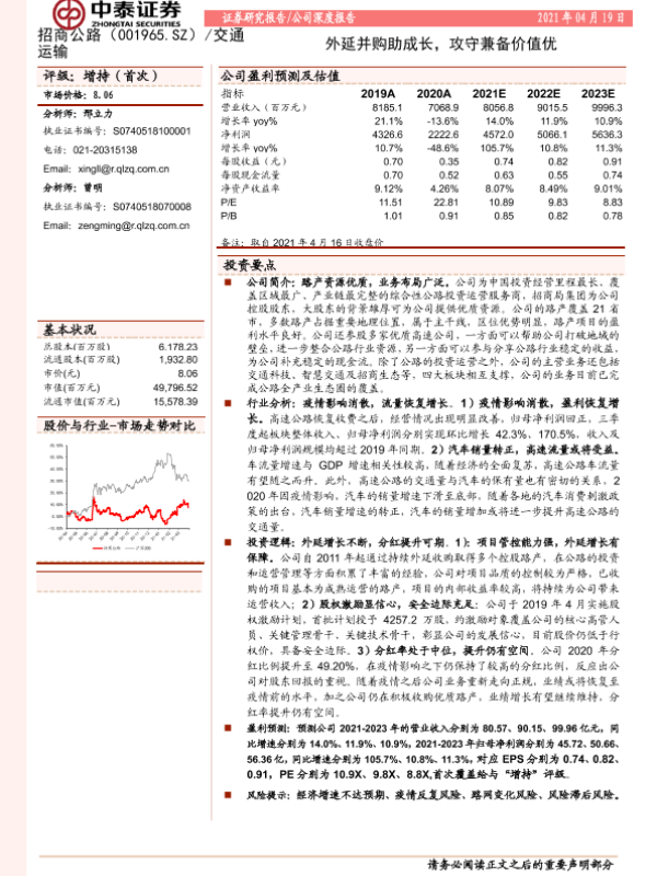 【中泰证券】【20210419】中泰证券-招商公路-001965.SZ-外延并购助成长,攻守兼备价值优-22页 行业研究