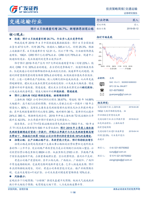 【广发证券】【20190512】交通运输行业投资策略周报:预计4月快递量同增26.7%,新增推荐招商公路-32页 行业研究
