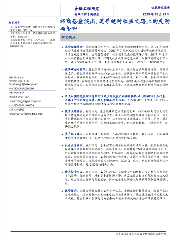 【海通证券】【20230523】金融工程专题报告:招商基金侯杰,追寻绝对收益之路上的灵动与坚守-20页 行业研究