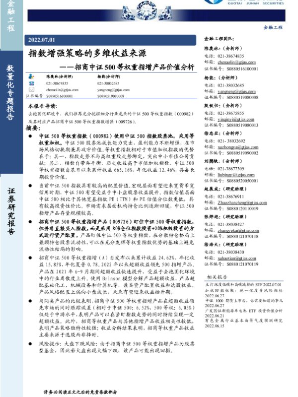 【国泰君安证券】【20220701】指数增强策略的多维收益来源——招商中证500等权重指增产品价值分析-26页 行业研究