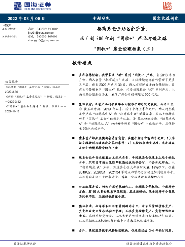 【国海证券】【20220809】“固收+”基金经理档案(三):招商基金王垠&余芽芳,从0到500亿的“固收+”产品打造之路-17页 行业研究