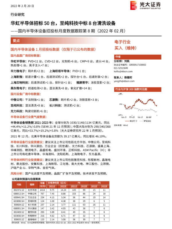 【光大证券】【20220220】国内半导体设备招投标月度数据跟踪第8期(2022年02月):华虹半导体招标50台,至纯科技中标8台清洗设备-18页 行业研究