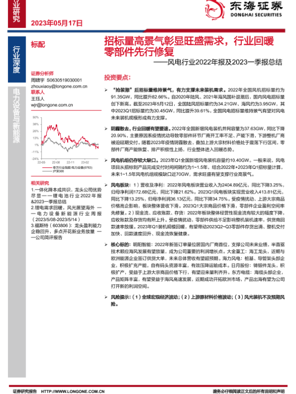 【东海证券】【20230517】招标量高景气彰显旺盛需求,行业回暖零部件先行修复——风电行业2022年报及2023一季报总结-15页 行业研究