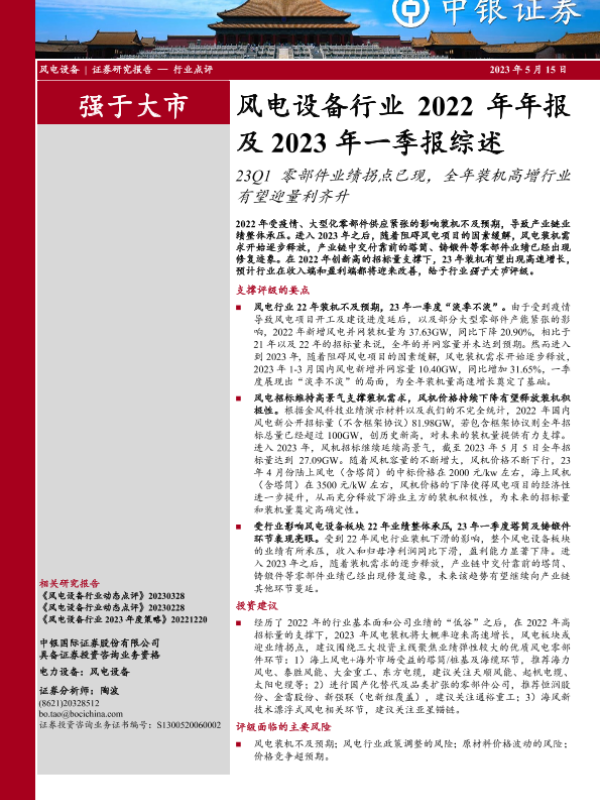 【中银证券】【20230515】风电设备行业2022年年报及2023年一季报综述:23Q1零部件业绩拐点已现,全年装机高增行业有望迎量利齐升-15页 行业研究