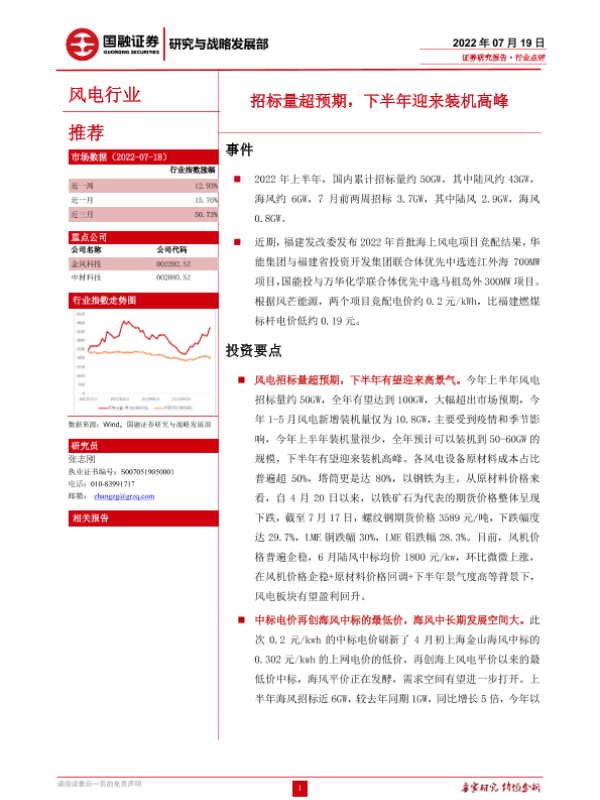 【国融证券】【20220719】风电行业点评:招标量超预期,下半年迎来装机高峰-3页 行业研究