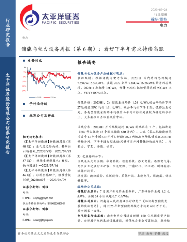 【太平洋证券】【20230726】储能与电力设备周报(第6期):看好下半年需求持续高涨-16页 行业研究