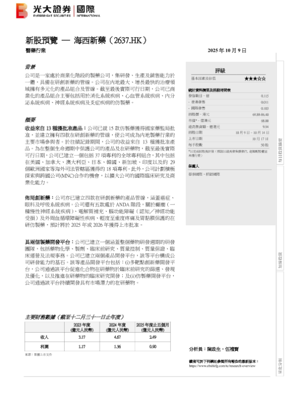 【光大证券国际】【202510】新股預覽 海西新藥(2637.HK)-3页 公司研究