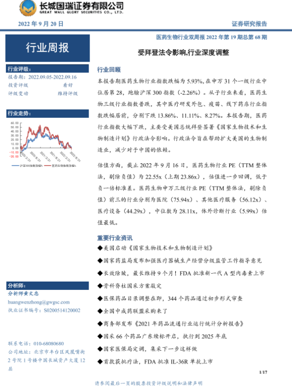 【长城国瑞证券】【20220920】医药生物行业双周报:受拜登法令影响,行业深度调整-17页 行业研究