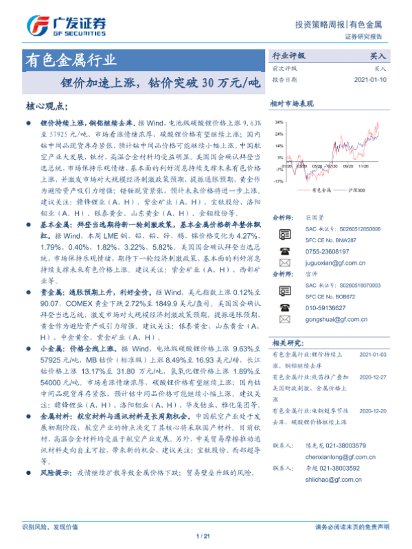 【广发证券】【20210110】20210110-广发证券-有色金属行业投资策略周报:锂价加速上涨,钴价突破30万元 吨-21页 行业研究