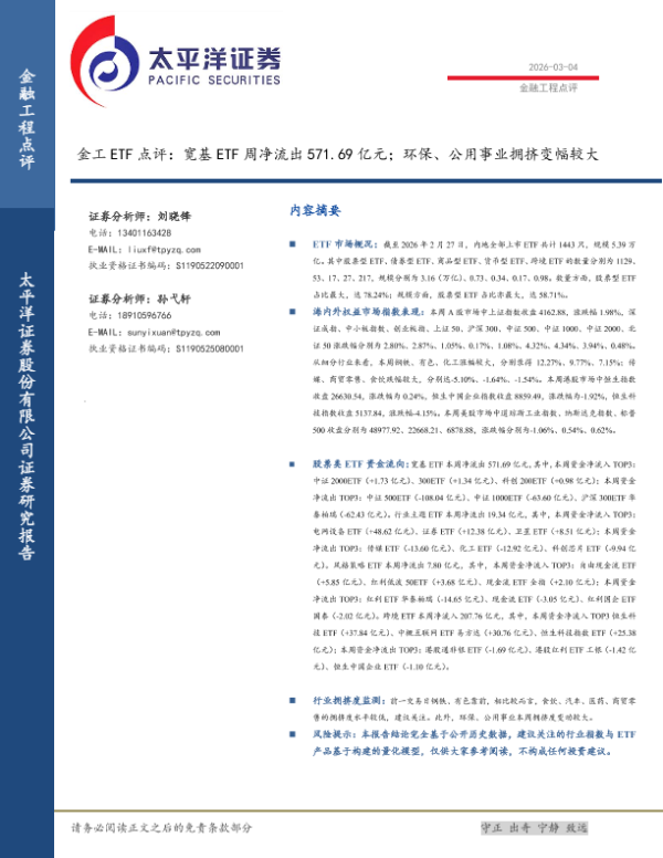 【太平洋证券】【202603】金工 ETF点评:宽基 ETF周净流出 571.69亿元;环保、公用事业拥挤变幅较大-16页 证券期货研究报告