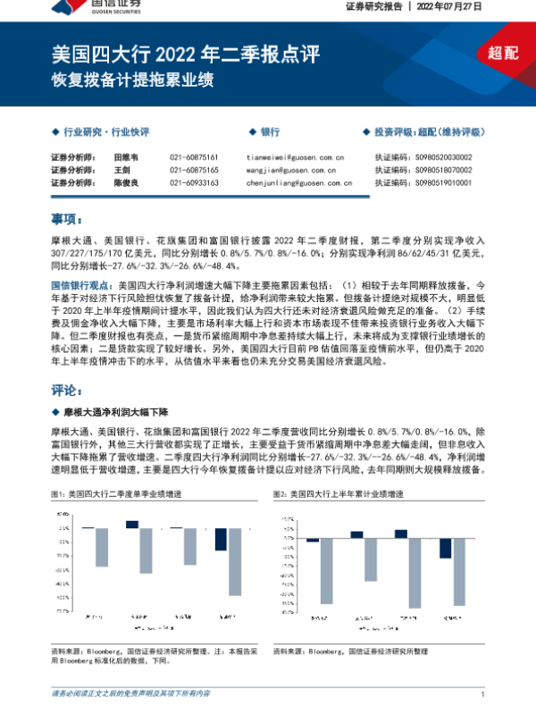【国信证券】【20220727】美国四大行2022年二季报点评:恢复拨备计提拖累业绩-11页 行业研究