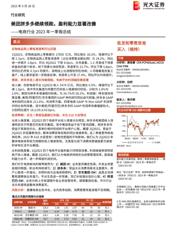 【光大证券】【20230528】电商行业2023年一季报总结:美团拼多多继续领跑,盈利能力显著改善-19页 行业研究