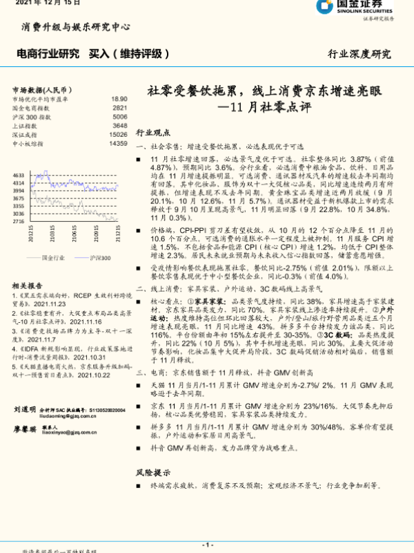 【国金证券】【20211215】11月社零点评-社零受餐饮拖累,线上消费京东增速亮眼-22页 行业研究