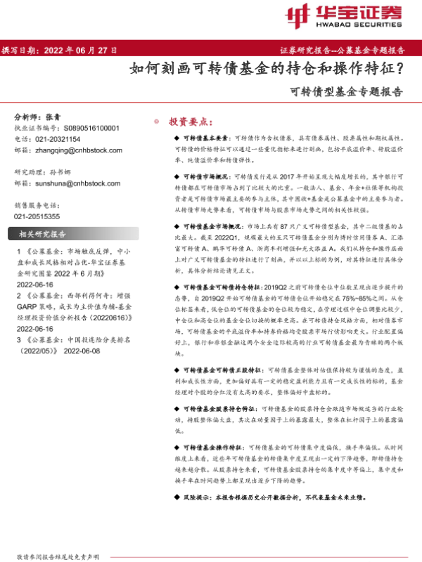 【华宝证券】【20220627】可转债型基金专题报告:如何刻画可转债基金的持仓和操作特征?-25页 行业研究