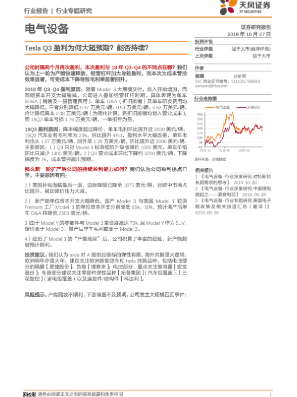 【天风证券】【20191027】电气设备行业专题研究:Tesla Q3盈利为何大超预期?能否持续?-11页 行业研究