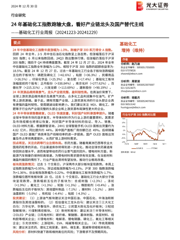 【光大证券】【20241230】24年基础化工指数跑输大盘,看好产业链龙头及国产替代主线-28页 行业研究