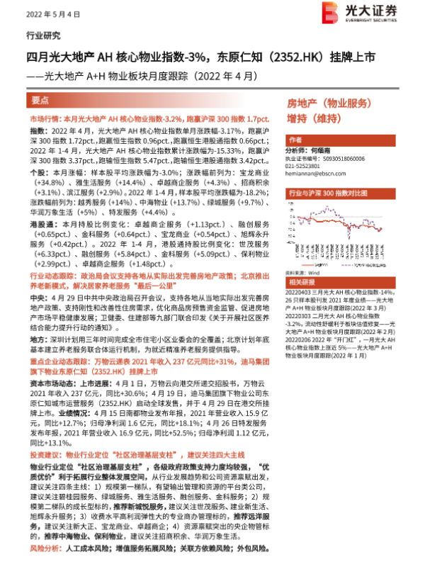 【光大证券】【20220504】四月光大地产AH核心物业指数-3%,东原仁知挂牌上市-13页 行业研究