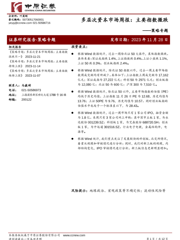 【中原证券】【20231128】策略专题:多层次资本市场周报:主要指数微跌-12页 行业研究