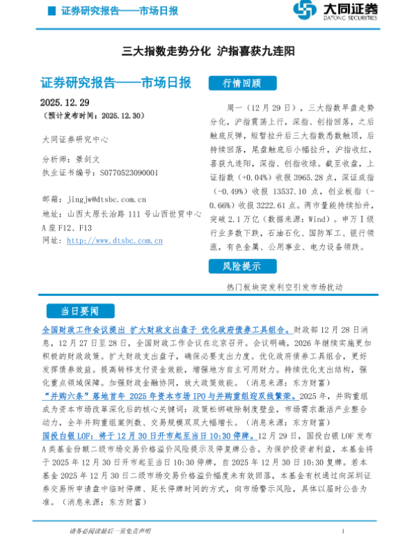 【大同证券研究中心】【202512】市场日报:三大指数走势分化 沪指喜获九连阳-5页 证券期货研究报告