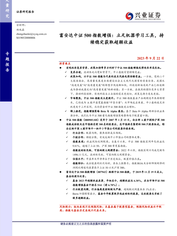 【兴业证券】【20230922】富安达中证500指数增强:立足机器学习工具,持续稳定获取超额收益-20页 行业研究