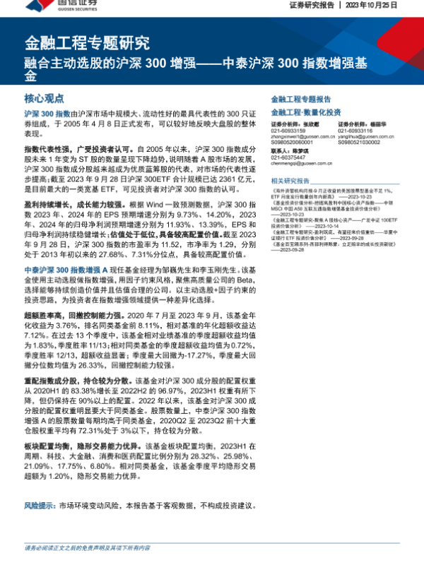 【国信证券】【20231025】金融工程专题研究:融合主动选股的沪深300增强——中泰沪深300指数增强基金-24页 行业研究