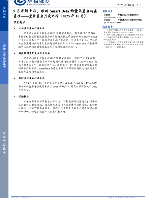 【华福证券】【202510】20251013-华福证券-量化基金月度跟踪(2025年10月)_9月市场上涨_跟踪Smart_Beta的量化基金跑赢基准-14页 证券期货研究报告
