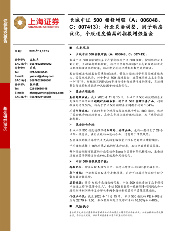 【上海证券】【20231117】长城中证500指数增强(A:006048、C:007413):行业灵活调整,因子动态优化,个股适度偏离的指数增强基金-20页 行业研究