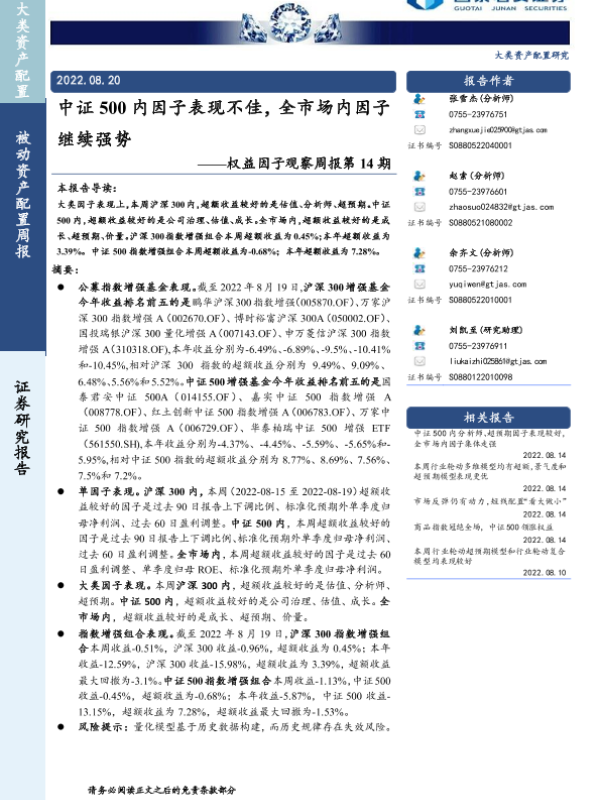 【国泰君安证券】【20220820】权益因子观察周报第14期:中证500内因子表现不佳,全市场内因子继续强势-16页 行业研究