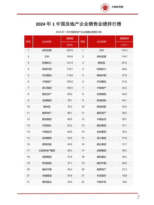 【中指研究院】【20240203】2024年1月中国房地产企业销售业绩排行榜-17页 行业研究