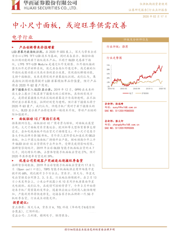 【华西证券】【20200217】电子行业:中小尺寸面板,或迎旺季供需改善-4页 行业研究