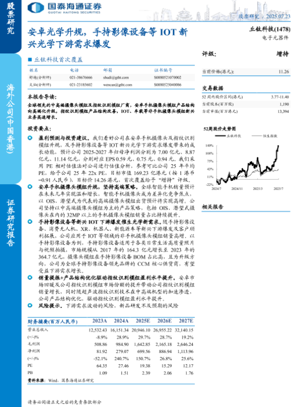 【国泰海通证券】【20250723】丘钛科技首次覆盖:安卓光学升规,手持影像设备等IOT新兴光学下游需求爆发-14页 证券期货研究报告