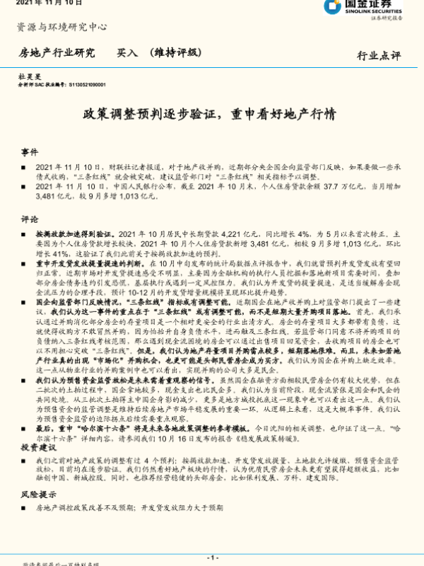 【国金证券】【20211110】房地产行业研究:政策调整预判逐步验证,重申看好地产行情-8页 行业研究
