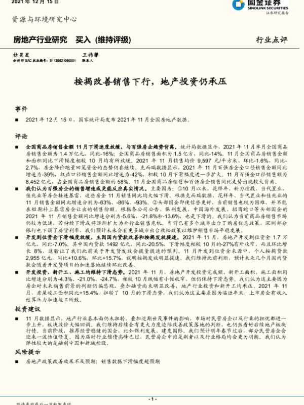 【国金证券】【20211215】按揭改善销售下行,地产投资仍承压-10页 行业研究