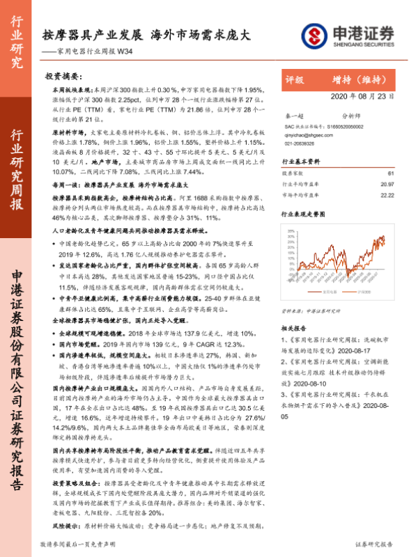 【申港证券】【20200823】家用电器行业周报:按摩器具产业发展 海外市场需求庞大-18页 行业研究