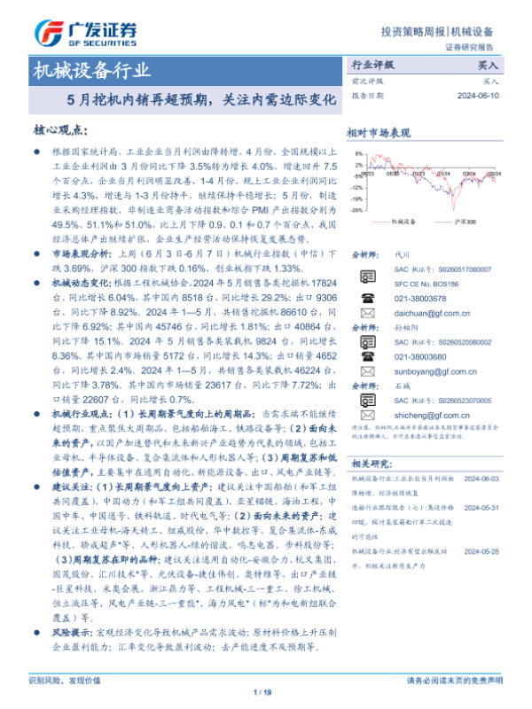 【广发证券】【20240610】20240610-广发证券-机械设备行业投资策略周报:5月挖机内销再超预期,关注内需边际变化-19页 行业研究