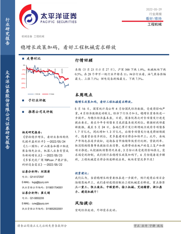 【太平洋证券】【20220529】20220529-太平洋-工程机械行业周报:稳增长政策加码,看好工程机械需求释放-20页 行业研究
