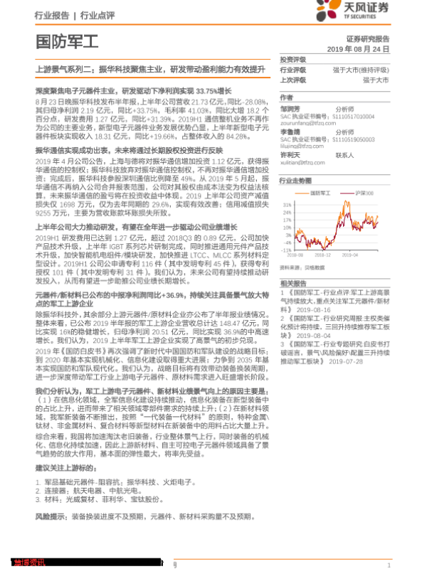 【天风证券】【20190824】国防军工:上游景气系列二:振华科技聚焦主业,研发带动盈利能力有效提升-3页 行业研究