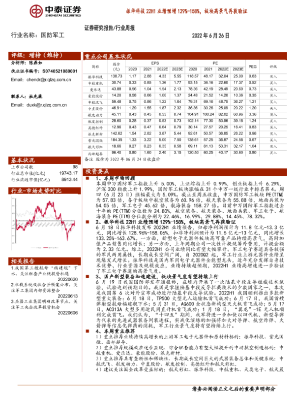 【中泰证券】【20220626】20220626-中泰证券-国防军工行业周报:振华科技22H1业绩预增129%-158%,板块高景气再获验证-17页 行业研究