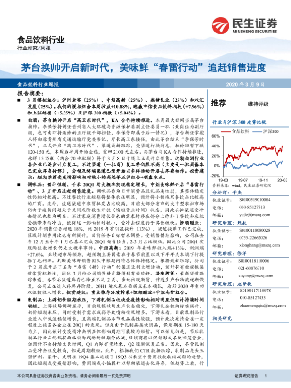 【民生证券】【20200309】20200309-民生证券-食品饮料行业周报:茅台换帅开启新时代,美味鲜“春雷行动”追赶销售进度-25页 行业研究
