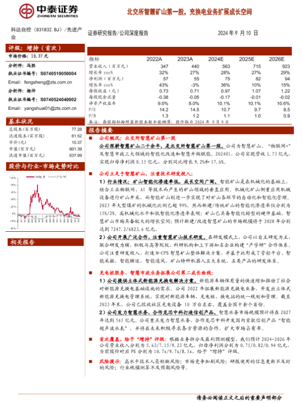 【中泰证券】【20240910】科达自控(831832)北交所智慧矿山第一股,充换电业务扩展成长空间-17页 行业研究